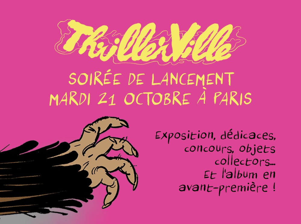 Venez fêter avec nous le lancement de la BD « Thrillerville » lors d’une soirée festive, gratuite et ouverte à tous mardi 21 octobre ! Exposition, dédicaces, concours, objets collector, cocktail… cette soirée vous réserve de nombreuses surprises. Alors ne manquez pas cette occasion de rencontrer les auteurs et de repartir avec votre album dédicacé en avant-première. Galerie Daniel Maghen : 36 rue du Louvre, Paris 1er. Plus d’informations bientôt !